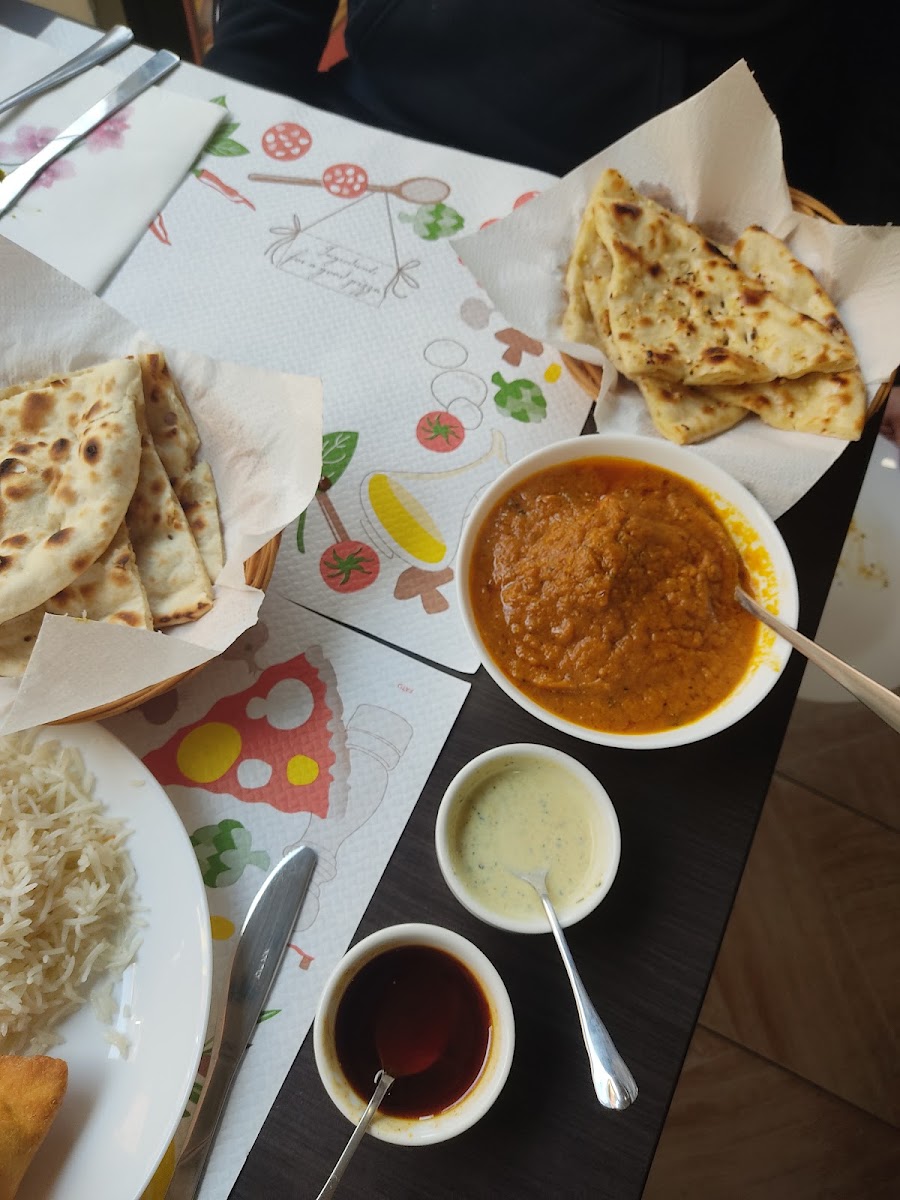 The menu highlights staple dishes that reflect real home-style cooking from the South Asian subcontinent. The Paneer Butter Masala stands out for its rich but well-balanced creaminess, while the Vegetable Biryani and Seekh Kebab Curry cater to those who enjoy aromatic, spiced meals without being overwhelming. Fried snacks like Pakora Veg (6 pezzi) make for excellent starters or quick bites. The assortment of freshly baked Indian breads, including Tandoori Roti and various types of naan, complements these dishes well.
