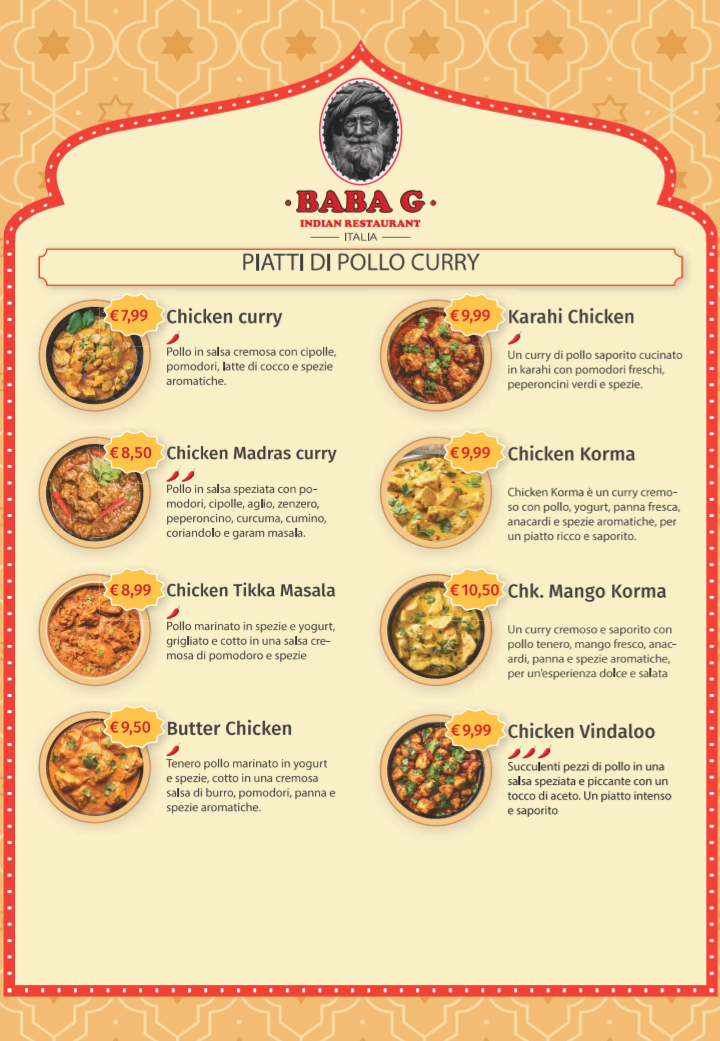 For main courses, the Piatti Con Pollo Al Curry section highlights a variety of chicken dishes prepared with different types of curry and spices, such as Peshwari Chicken, Chicken Dry, Chicken Jalfrezi, Karahi Chicken, and Chicken Korma. These dishes combine chicken with ingredients like yogurt, almonds, peppers, onions, and tomatoes.
